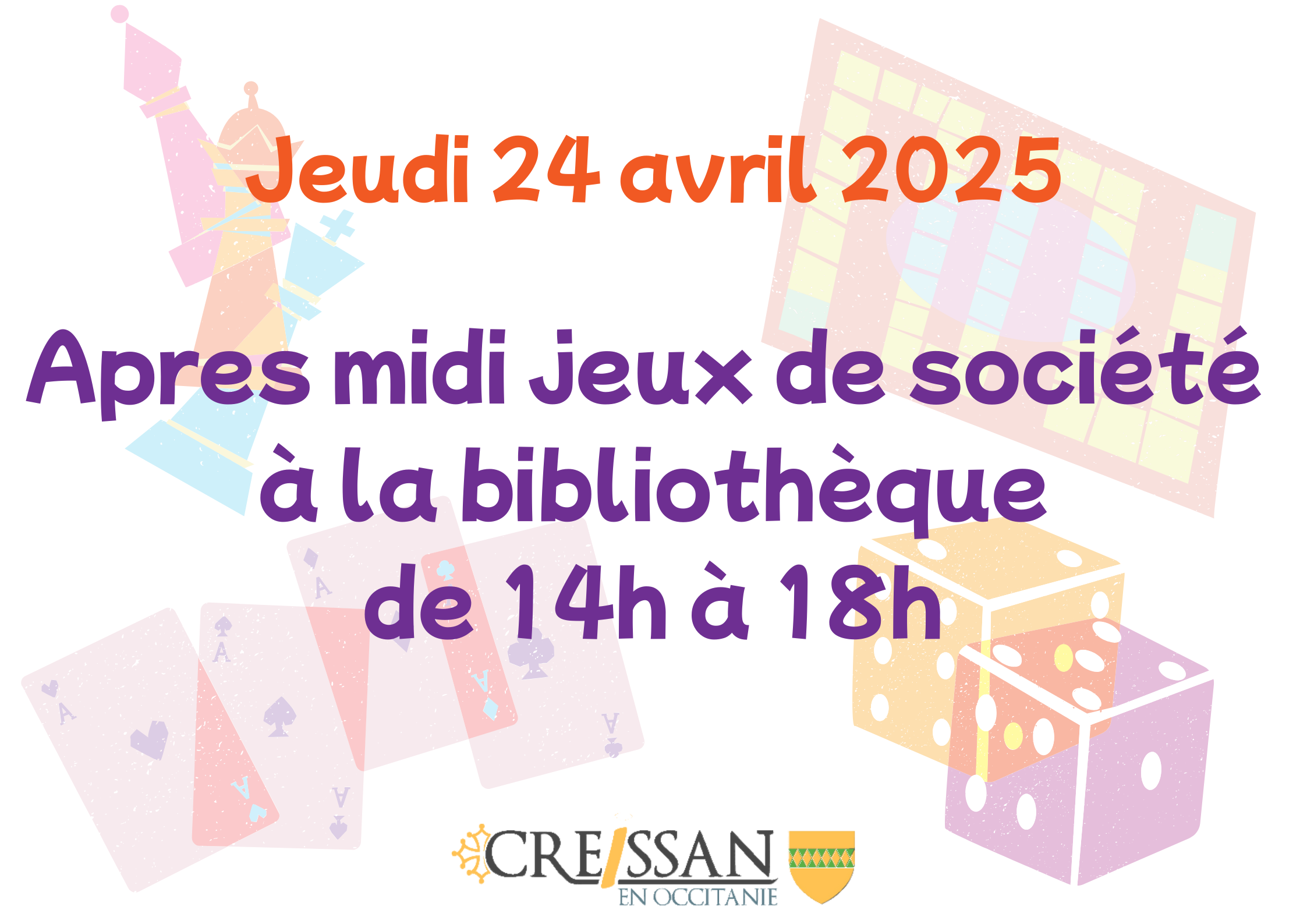Venez passez un moment de détente en famille à la bibliothéque de Creissan avec des jeux de société pour tous âges.